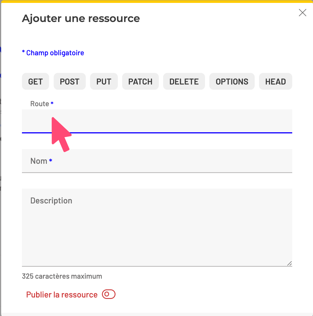 Dans le cas où une route possède plusieurs variables, vous pouvez définir celles-ci dans le champs route de la pop-in "Ajouter une ressource". Il suffit de rajouter ":", derrière le slash et devant le nom de la variable.